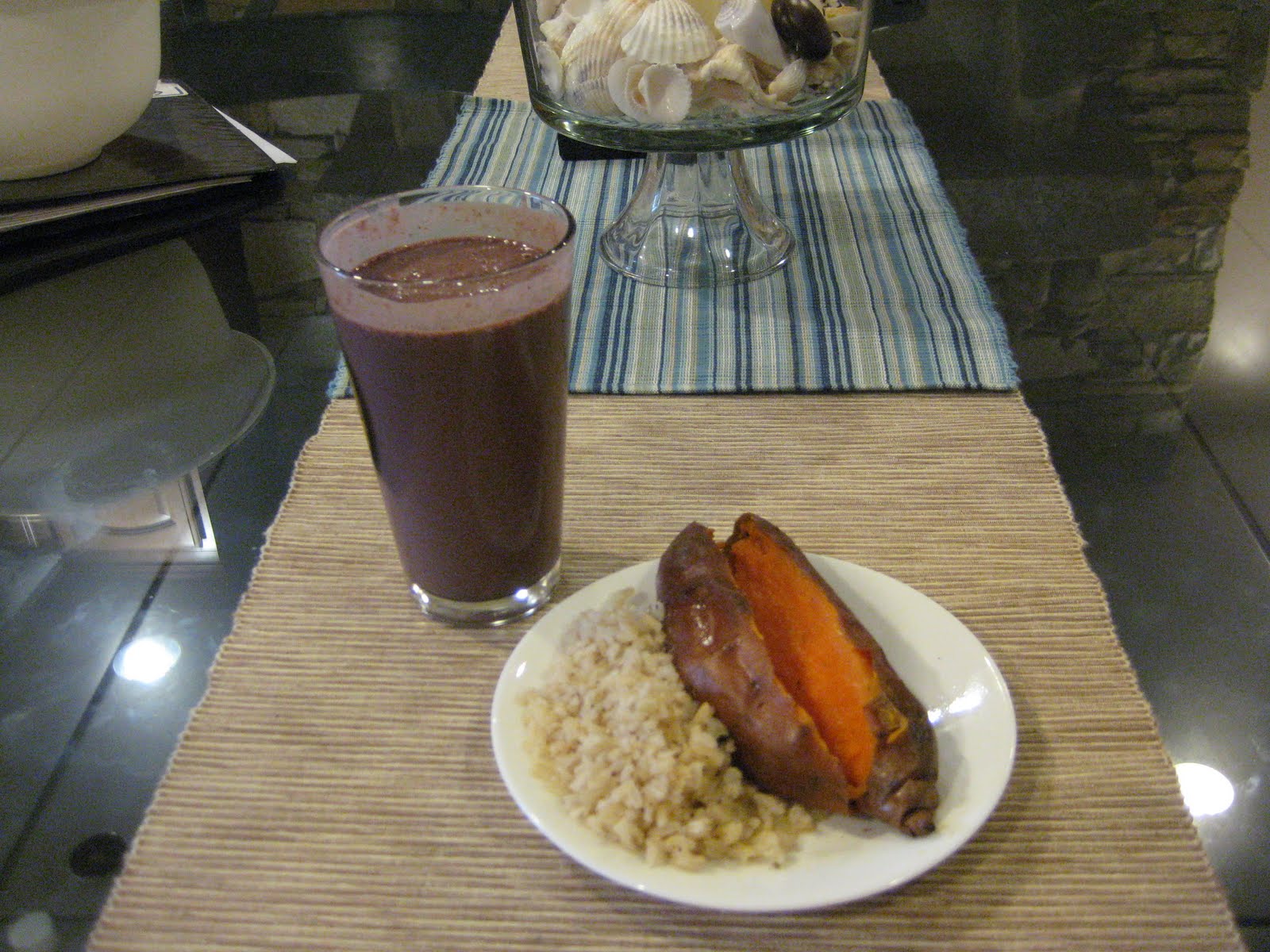 Dinner was nothing special, 1 baked sweet tater,brown rice and a chocolate berry protein shake. I just wasn't in the mood for meat and needed some quick protein. I didn't quite finish everything, I was too full.